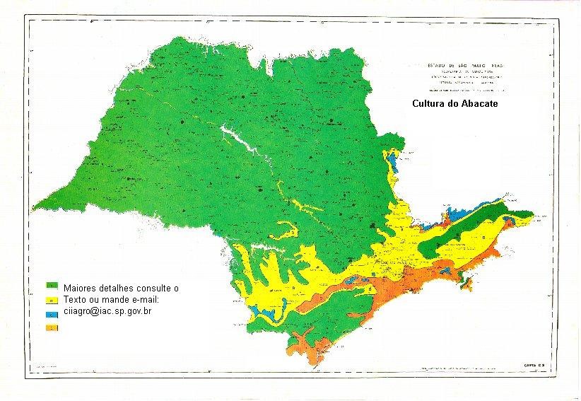 Mapa da Aptidão climatica para Cultura do Abacate Aptidão agroclimática da cultura do Abacate Segundo Leon (1968), os tipos silvestres do abacate (Persea americana Mill) se encontram em regiões montanhosas desde o México até Costa Rica, na América Central. Comercialmente, Ochse et al. (1965) informam que o abacate é cultivado em toda a faixa intertropical, incluindo áreas subtropicais como o sul dos Estados Unidos, norte da Argentina e do Chile, sul do Brasil, África do Sul, Austrália, etc... Exigência climáticas São conhecidas três raças de abacate com distintas exigências climáticas com referência ao fator térmico: Antilhana, Guatemalense e Mexicana. A raça Antilhana, ou das Índias Ocidentais, é natural das terras baixas das Américas Central e Sul, com altitude inferior a 800 metros. São exigentes em calor e umidade e prejudicadas onde as temperaturas atingem 6ºC ou menos. São favorecidas por abundância de precipitações, especialmente em clima tipo monçonico com verão chuvoso e inverno seco. A raça Guatemalense é originária das terras altas da América Central e sul do México, com altitudes entre 800 e 2400 metros. Pode ser considerada subtropical. Pode ser cultivada onde as médias de temperaturas mínimas mostram-se superiores a 4,5ºC. A raça Mexicana tem origem nas terras bem altas do México, Equador, Peru e Chile, com altitudes entre 2400 e 2800 metros. É muito resistente ao frio, podendo suportar temperaturas mínimas até 2,2ºC. Todas as raças de abacate exigem solos profundos e bem drenados, com clima úmido e semi-úmido. O excesso de umidade estimula as infecções. É preferível região com estações bem definidas, com clima tropical, tipo moncônico, a regiões com regime pluviométrico anual uniforme. Parâmetros climáticos adotados Os parâmetros adotados na definição dessas exigências climáticas básicas para as três raças de abacate foram baseados nos valores das temperaturas médias anuais e dos índices hídricos, segundo Thornthwaite (1948). As médias termométricas anuais normais estão estreitamente relacionadas com as mínimas extremas indicadas por Ochse et al. (1965) como indicativas das exigências das diferentes raças do abacate. No preparo da carta da aptidão climática para a cultura do abacate foram considerados os requerimentos climáticos das diferentes raças. a) temperatura média anual, (Ta) de 17ºC indica o limite abaixo do qual aparecem as restrições marcantes para a cultura comercial do abacate; condicionando a inaptidão para a raça Antilhana e a marginalidade climática para a raça Guatemalense, particurlarmente por estarem sujeitas aos danos das geadas; b) Ta de 17 a 19ºC indicam os limites da faixa com plena aptidão térmica para as variedades das raças Mexicana e Guatemalense e marginalidade para a raça Antilhana por restrições térmicas; c) índice hídrico, (Im) igual a 100 corresponde ao limite de umidade climática acima do qual aparece marginalidade para as três raças, por problemas fitossanitários provocados por excesso de umidade. Cartografia faixas de aptidão climática As faixas com as diferentes classes de aptidão climática previstas para as variedades das três raças de abacate foram: Faixa "A" Ta, acima de 19ºC e Im, inferior a 100. É considerada climaticamente apta as três raças. As condições térmicas e hídricas apresentam-se satisfatórias à vegetação, à frutificação e à sanidade da cultura. Essa faixa compreende praticamente quase todo o Planalto Paulista. As áreas serranas, das Serras do Mar e da Mantiqueira, muito frias, estão fora por apresentar problemas de deficiências térmicas para a raça Antilhana. Faixa "B" Ta, entre 17 e 19ºC e Im, inferior a 100. É considerada apta às raças subtropicais, Mexicana e Guatemalense, mais adaptadas ao frio. A raça Antilhana, essencialmente tropical, encontra problemas de restrição térmica e de geadas prejudiciais, nesta faixa. A faixa foi considerada marginal para a cultura comercial. Situa-se na parte sul do Planalto Paulista, abrangendo as áreas serranas da Serra do Mar, da Mantiqueira e seus contrafortes. Faixa "C" Ta, inferior a 17ºC. Esta faixa, compreendendo as áreas mais altas e frias do Estado, foi considerada apenas marginal para as variedades das raças Guatemalense e Mexicana, que podem encontrar possibilidade de cultura comercial, embora alguns cultivares possam sofrer restrições por deficiência térmica. Para a raça Antilhana, a faixa foi considerada inapta para a cultura comercial, por apresentar deficiências limitantes e estar sujeita a incidência de geadas. A faixa compreende algumas pequenas áreas, nos pontos mais altos das zonas serranas do Estado, como a região de Campos do Jordão, na região da Bocaina, na Serra do Mar e na de Itapeva, na Serra de Piracicaba, sul do planalto. Faixa "D" Im, superior a 100. Indica condições de clima super úmido. A faixa se apresenta marginal para todas as raças de abacate, por estar muito sujeita a problemas fitossanitários. Abrange a maior parte da faixa litorânea e vertente marítima da Serra do Mar, no sul do Estado.